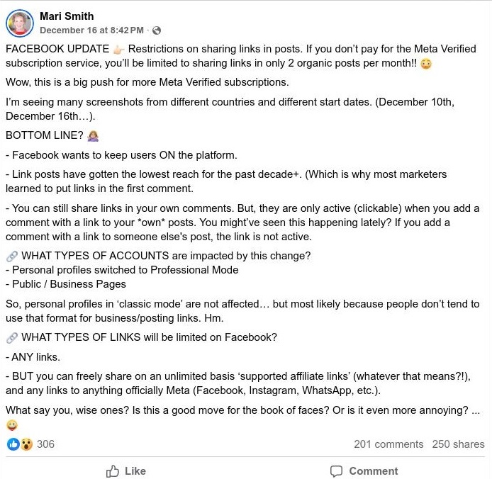 According to reports first highlighted by social media expert Mari Smith on December 16, 2025, Facebook is testing a restriction that allows only two link posts per month for professional profiles and business pages that are not subscribed to Meta’s paid offerings.