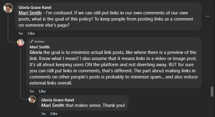 Industry experts explaining why Facebook limits link posts but still allows links in comments